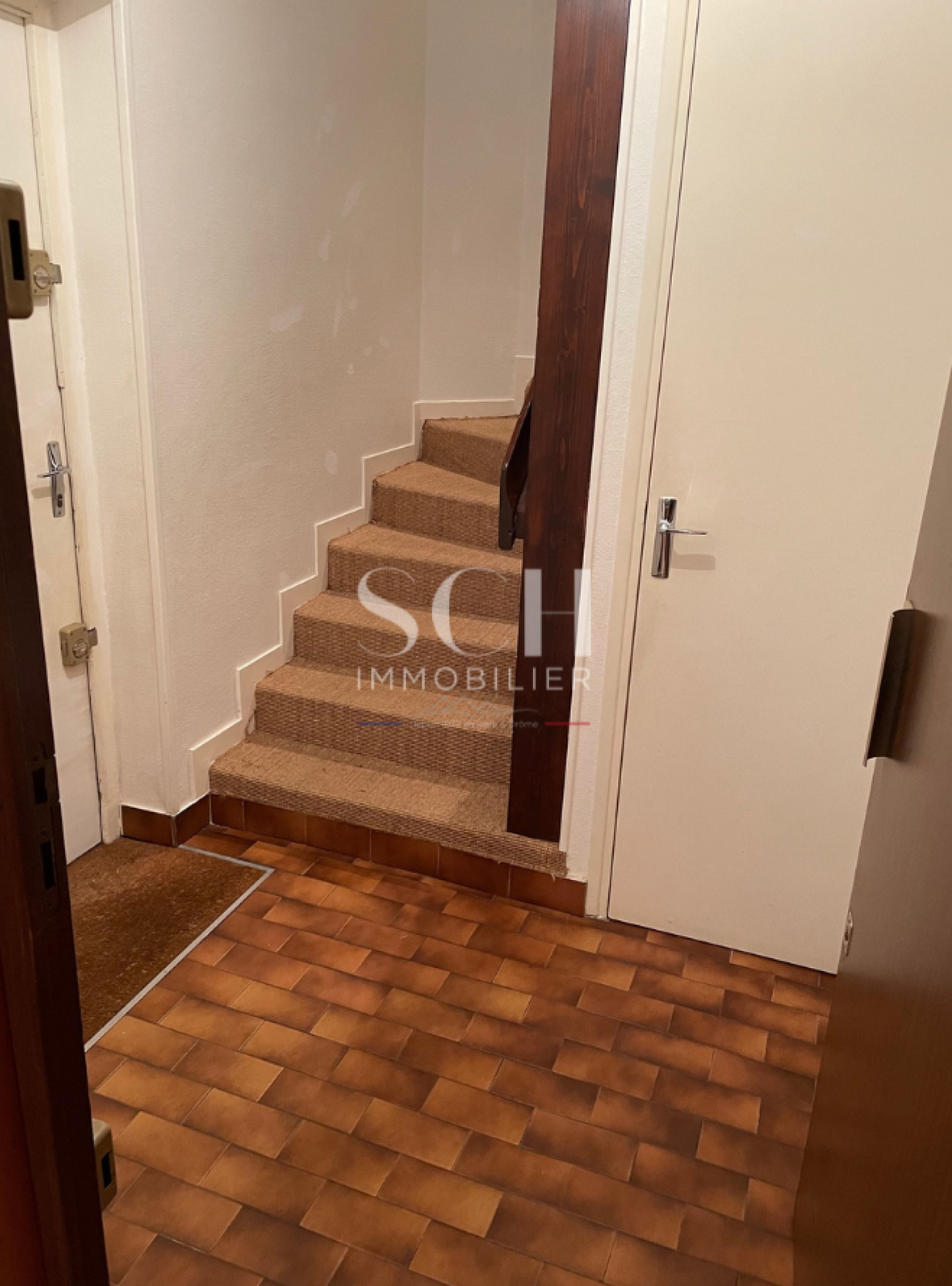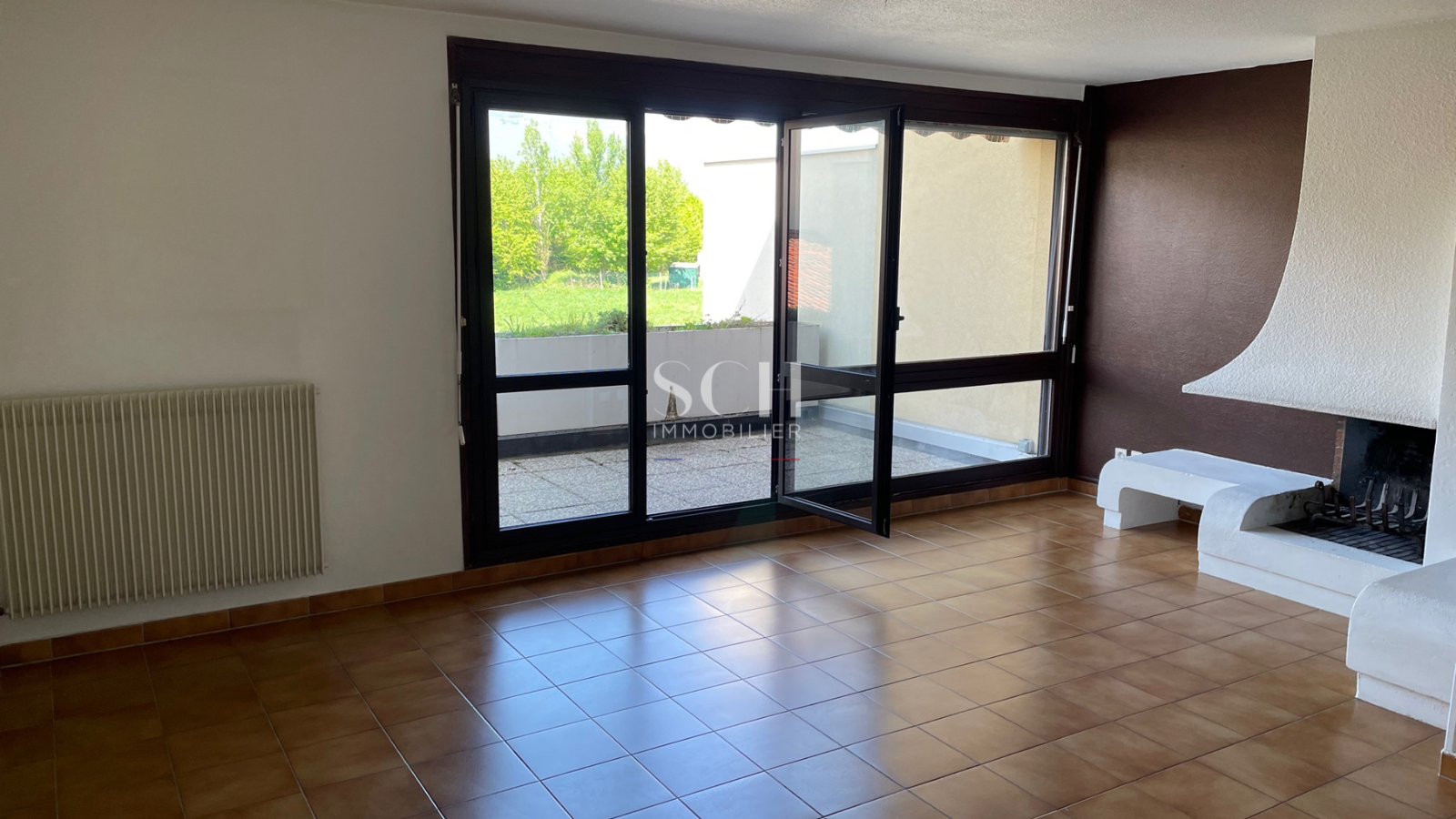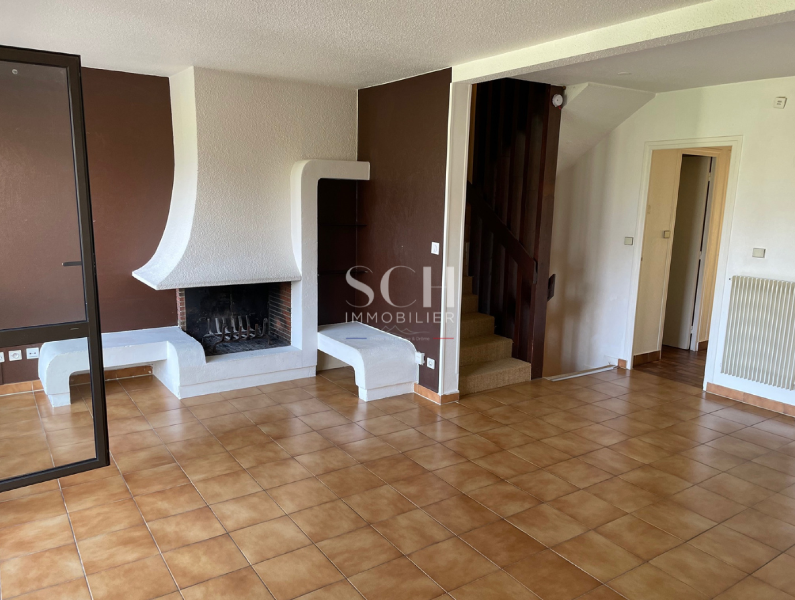 1ère étage : Un espace séjour avec baie vitrée terrasse Ouest et cheminée à foyer ouvert. Cuisine semi-équipée donnant sur une terrasse Est.