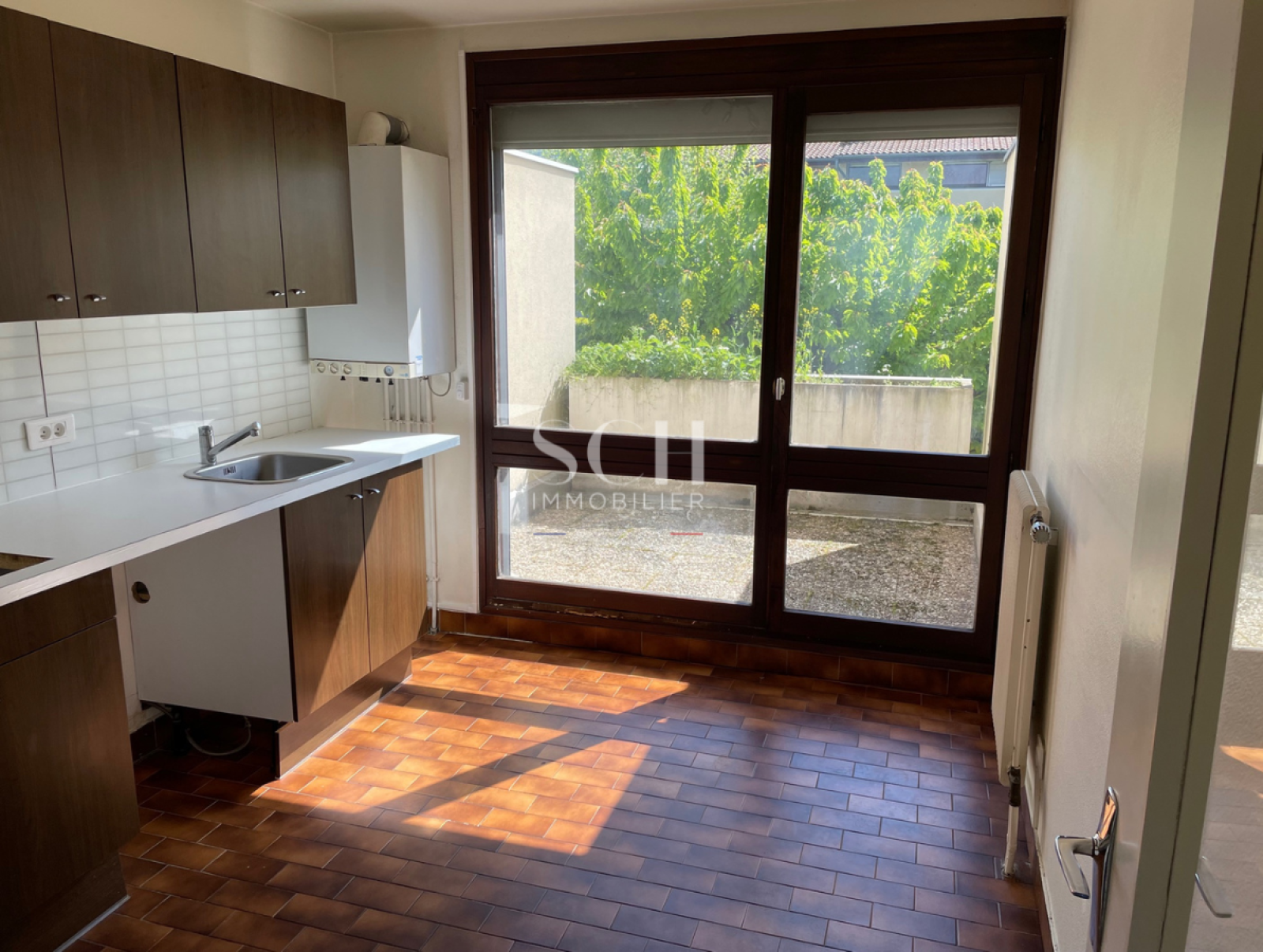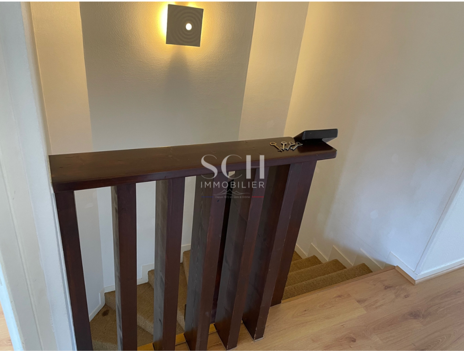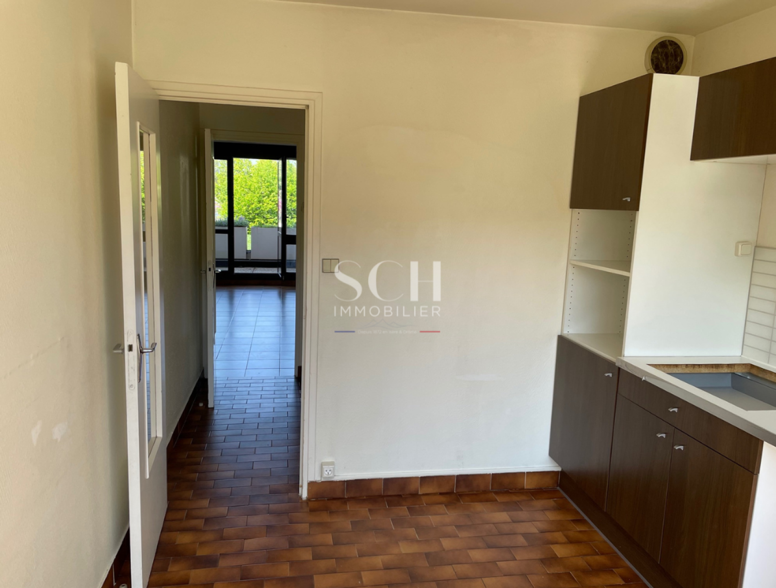 1ère étage : Un espace séjour avec baie vitrée terrasse Ouest et cheminée à foyer ouvert. Cuisine semi-équipée donnant sur une terrasse Est.