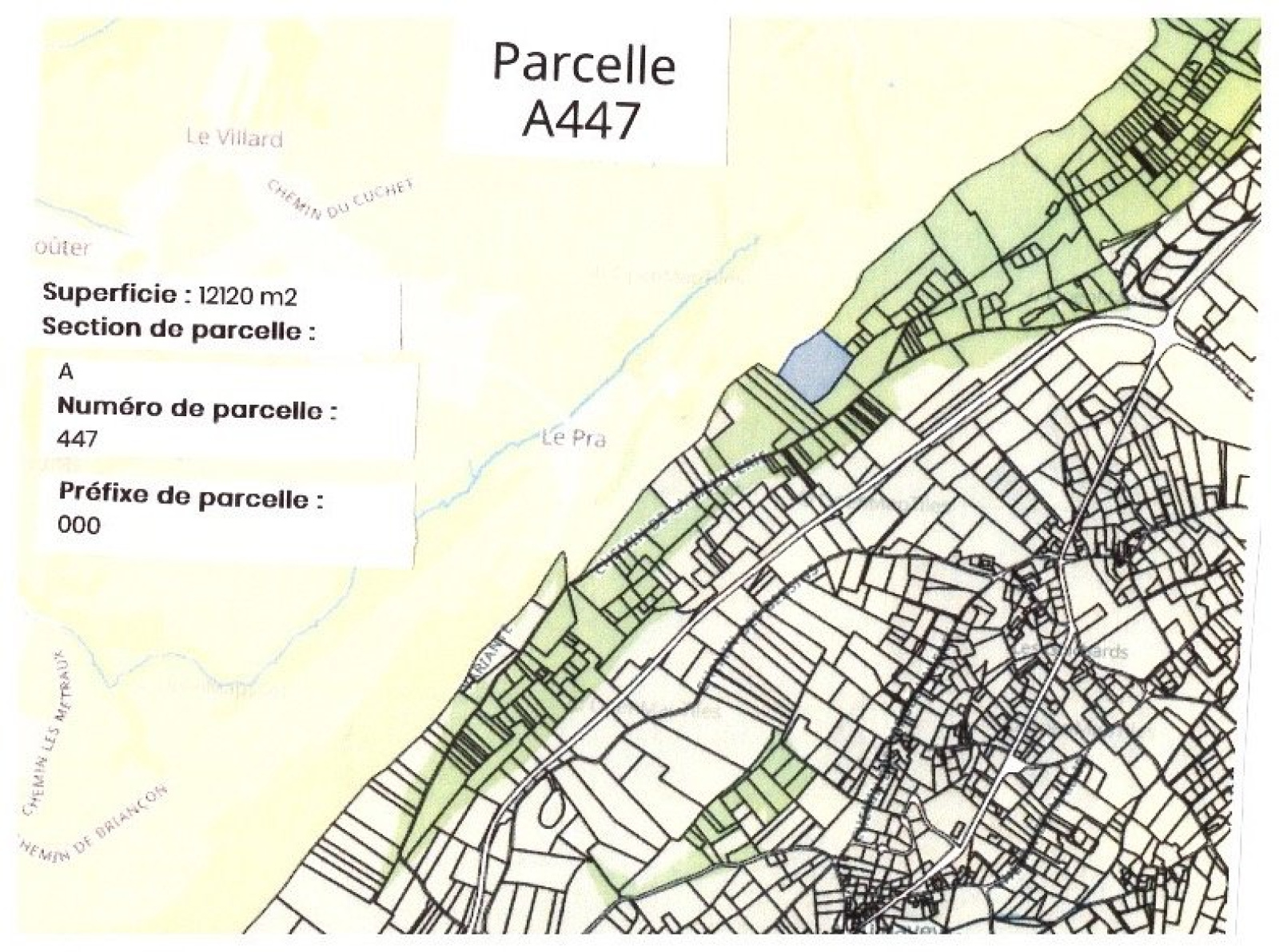 Votre agence 4% immobilier Eybens vous propose, à Vaulnaveys-Le-Haut au Colet un terrain non constructible. Parcelle A447 Superficie: 12120m2 Section de parcelle :A Numéro de parcelle : 447 Préfixe de parcelle : 000