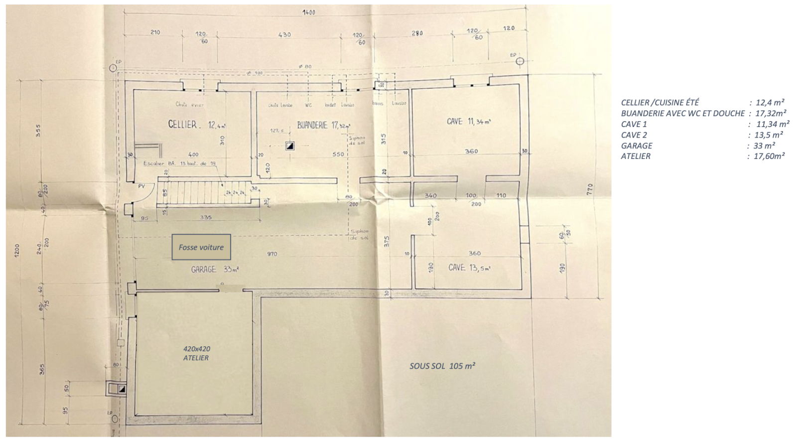 - RDC 105 m2 aménagé : garage 2 voitures + buanderie avec douche / WC + 2 caves + atelier + cuisine d'été extérieure.